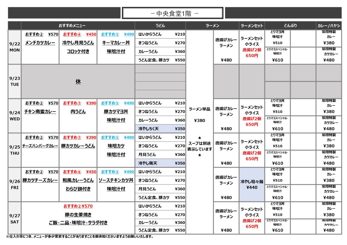【大工大】大宮:中央食堂1階 9月22日からの1週間メニュー