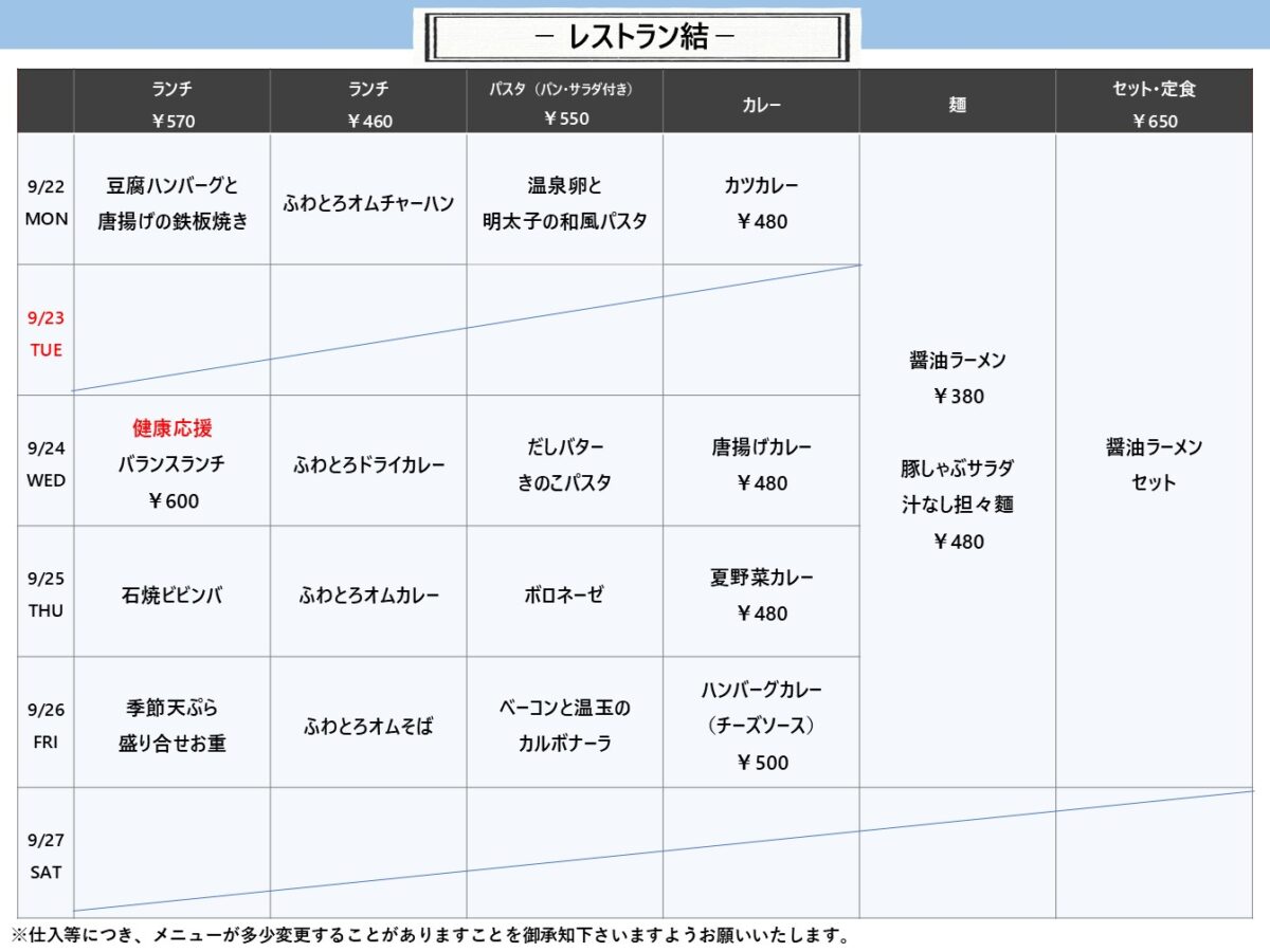 【摂南大】枚方:レストラン結 9月22日からの1週間メニュー