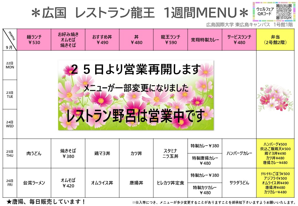 【広国大】東広島:レストラン龍王 9月22日からの1週間メニュー