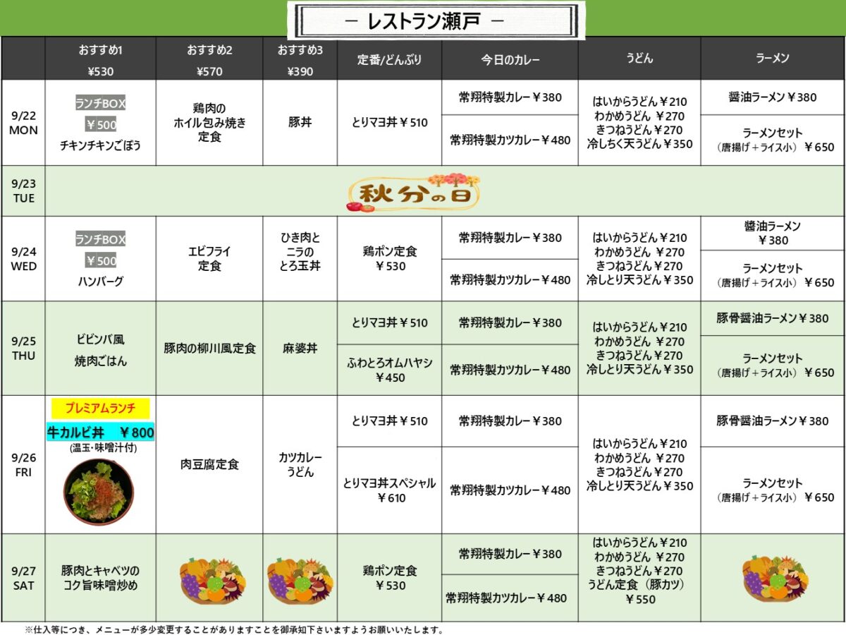 【広国大】呉: レストラン瀬戸 9月22日からの1週間メニュー