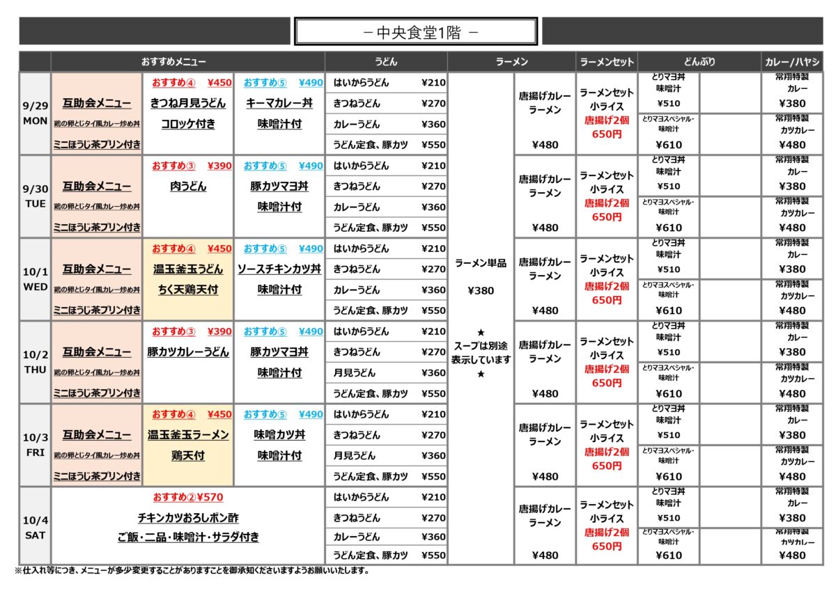 【大工大】大宮:中央食堂1階 9月29日からの1週間メニュー