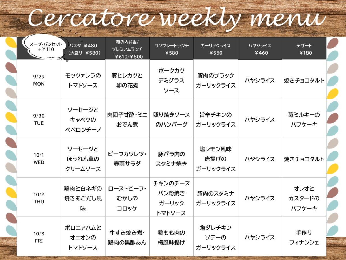 【大工大】大宮:チェルカトーレ 9月29日からの1週間メニュー