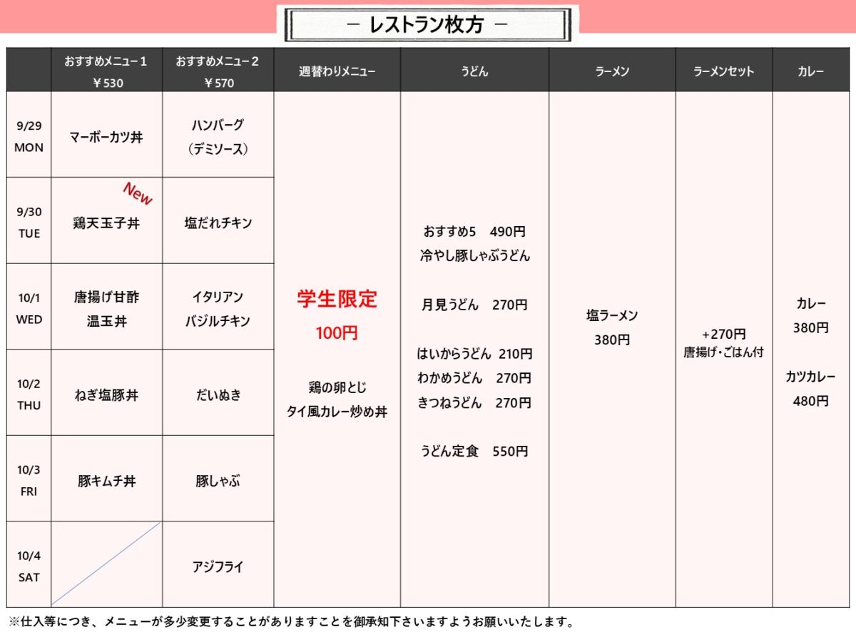 【摂南大】枚方:枚方食堂 9月29日からの1週間メニュー
