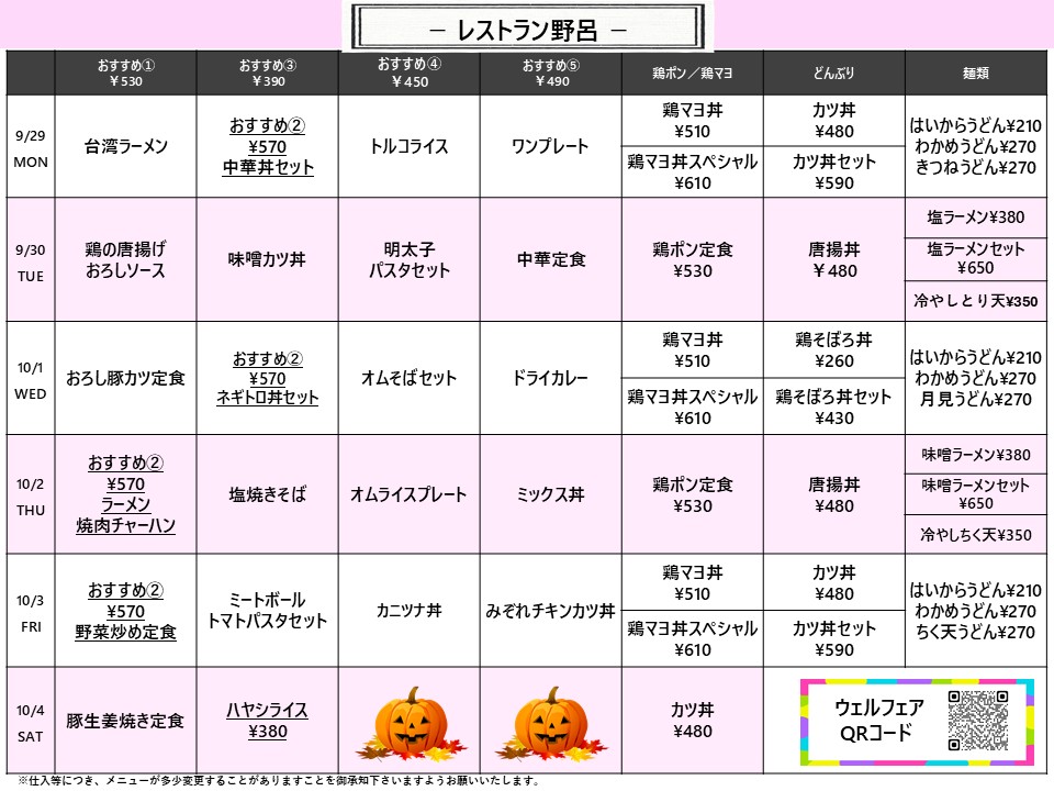 【広国大】東広島:レストラン野呂 9月29日からの1週間メニュー