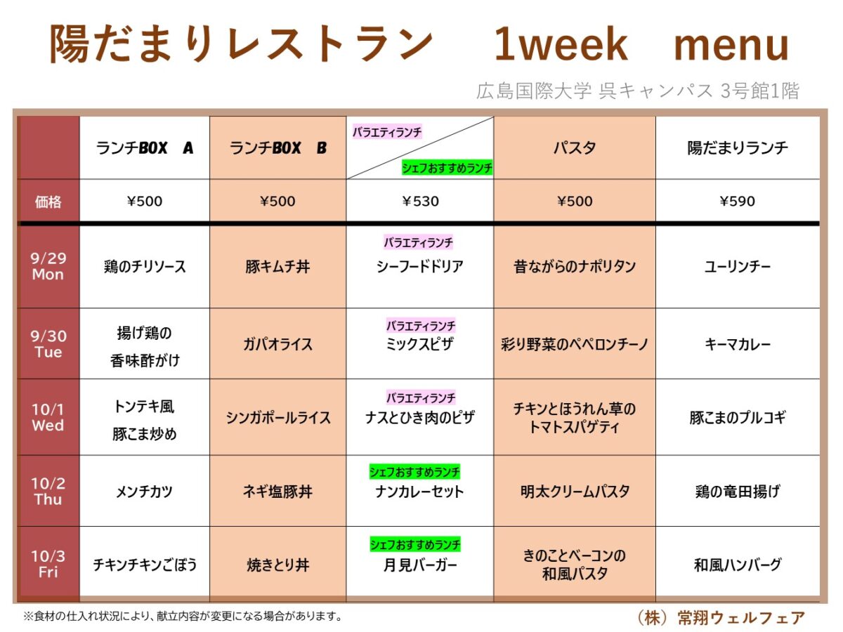 【広国大】呉: 陽だまりレストラン 9月29日からの1週間メニュー