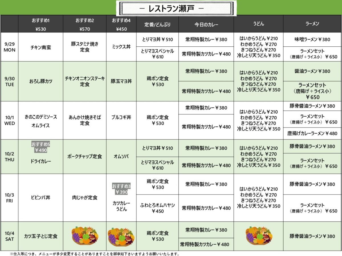 【広国大】呉: レストラン瀬戸 9月29日からの1週間メニュー