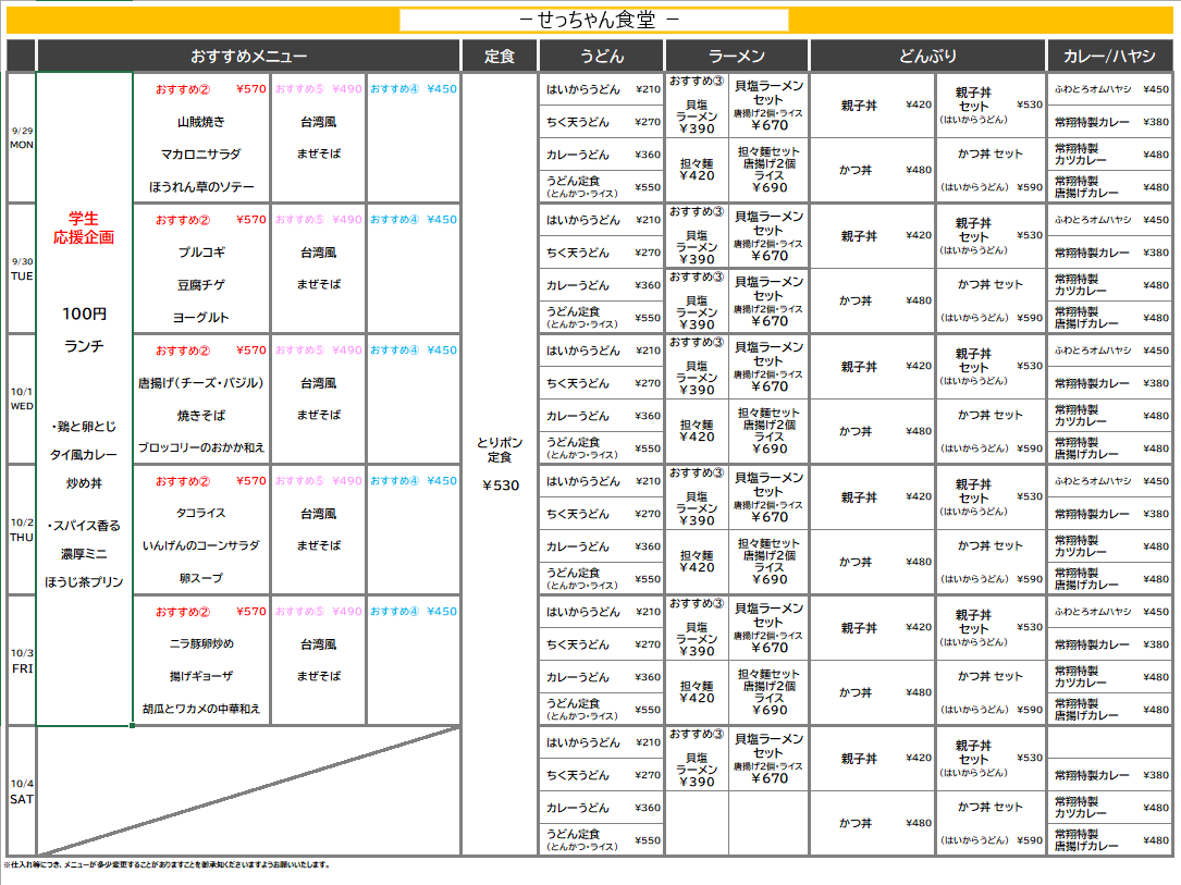 【摂南大】寝屋川:せっちゃん食堂 9月29日からの1週間メニュー