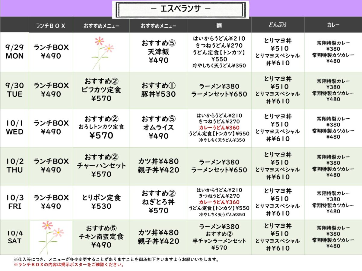【常翔学園中・高】エスペランサ 9月29日からの1週間メニュー