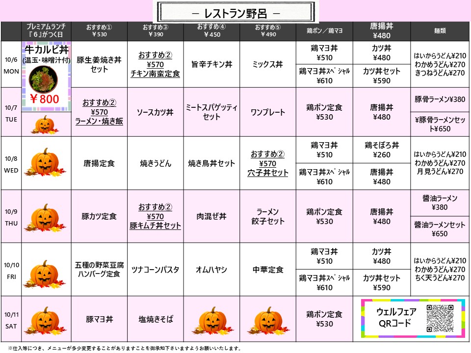 【広国大】東広島:レストラン野呂 10月6日からの1週間メニュー