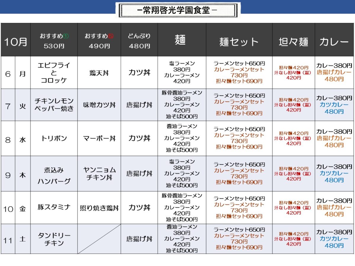 【常翔啓光中・高】啓光学園食堂 10月6日からの1週間メニュー