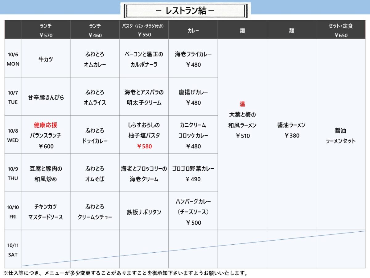 【摂南大】枚方:レストラン結 10月6日からの1週間メニュー