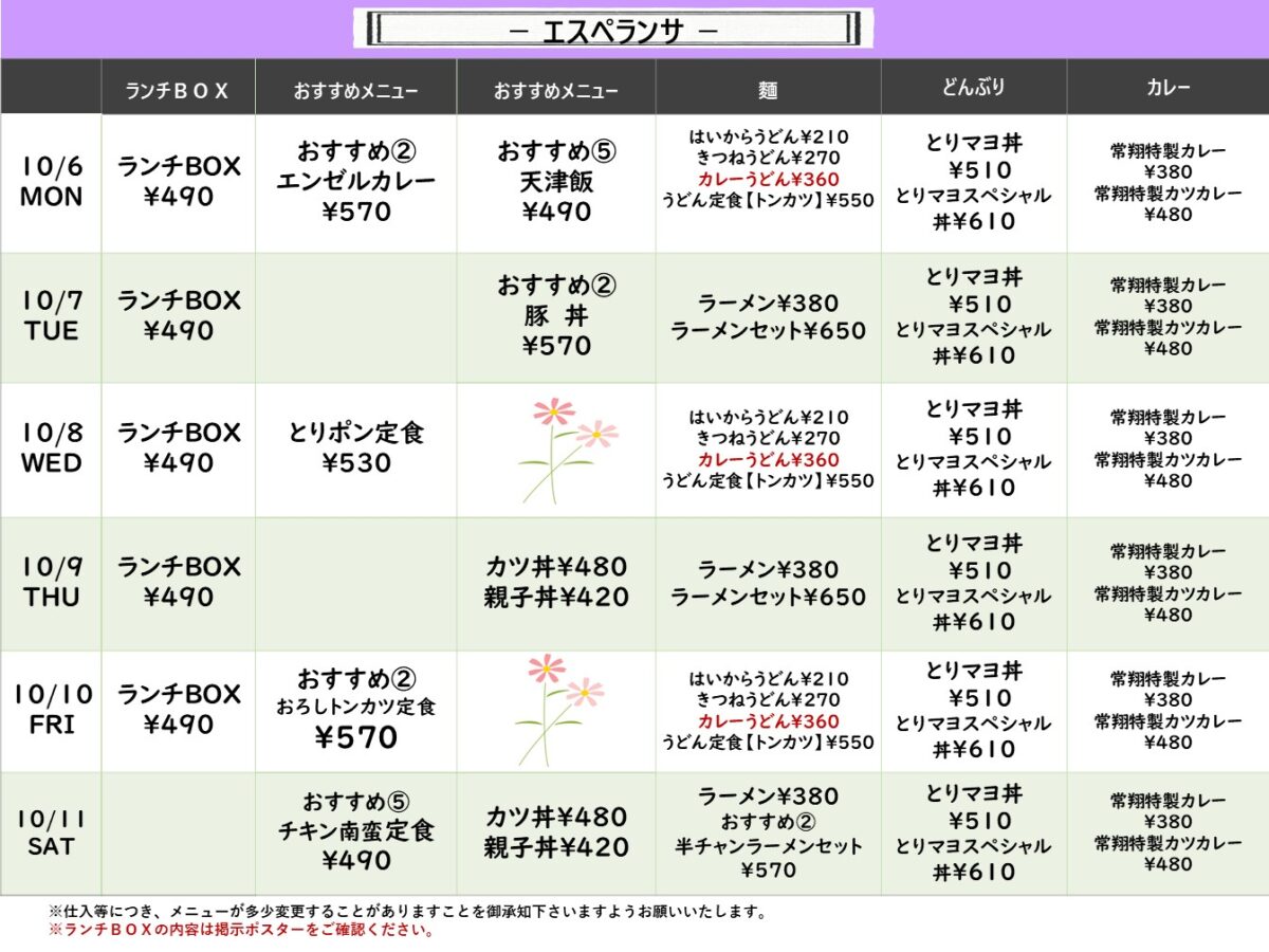 【常翔学園中・高】エスペランサ 10月6日からの1週間メニュー