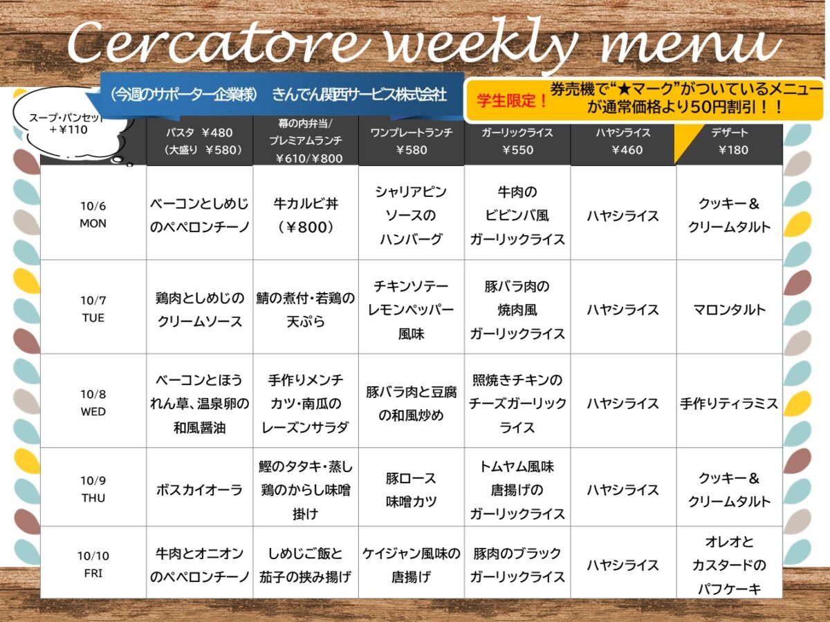 【大工大】大宮:チェルカトーレ 10月6日からの1週間メニュー
