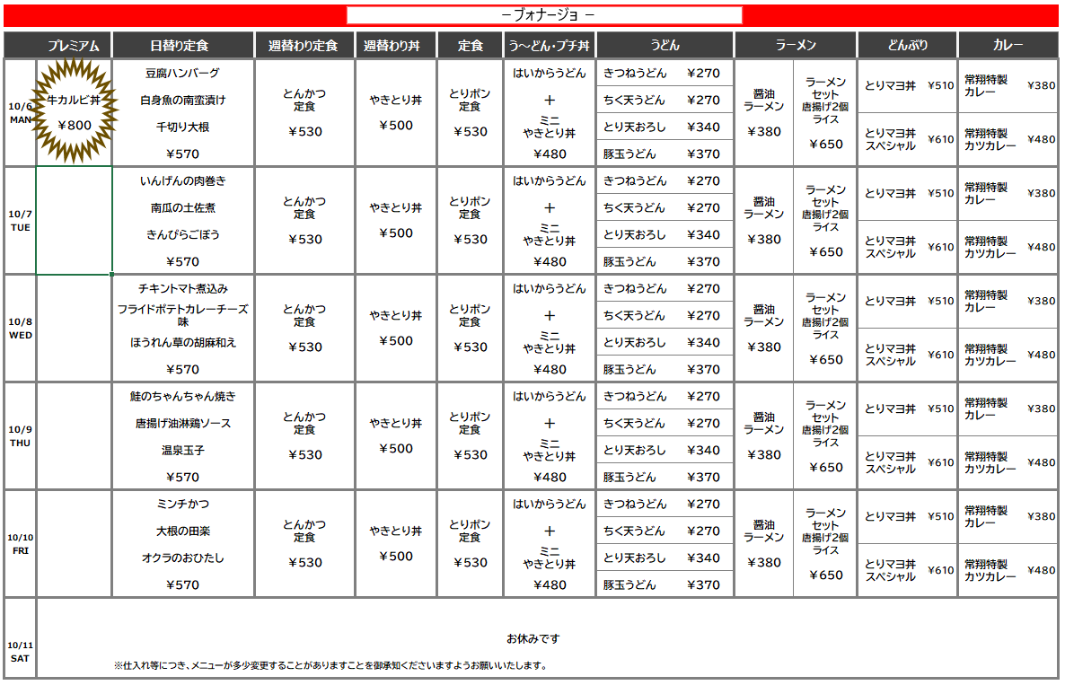 【摂南大】寝屋川:ブォナージョ 10月6日からの1週間メニュー