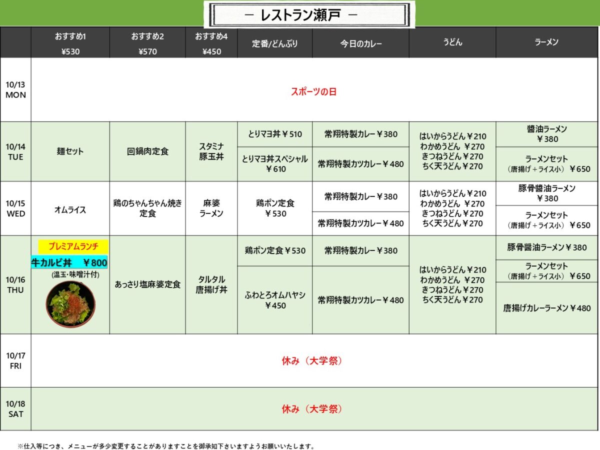 【広国大】呉: レストラン瀬戸 10月13日からの1週間メニュー