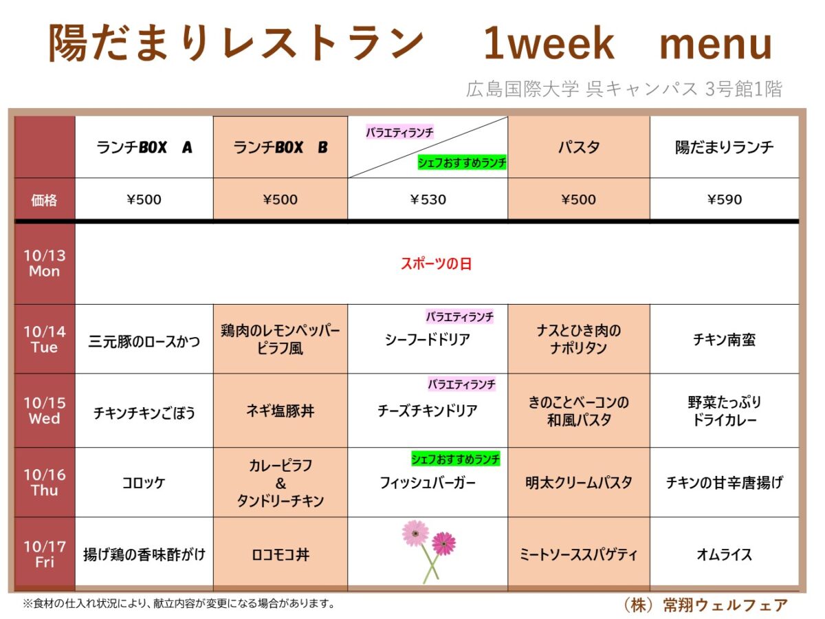 【広国大】呉: 陽だまりレストラン 10月13日からの1週間メニュー