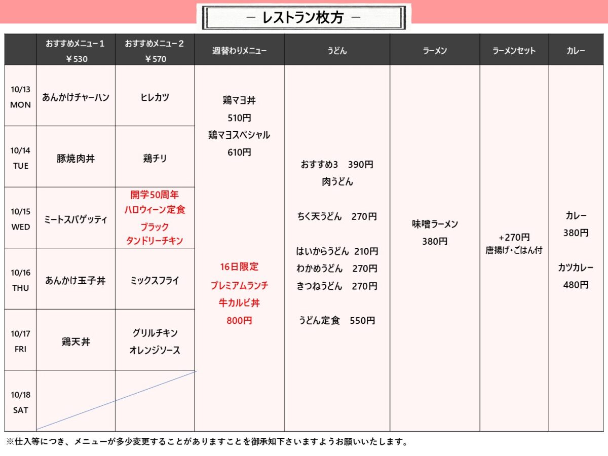 【摂南大】枚方:枚方食堂 10月13日からの1週間メニュー