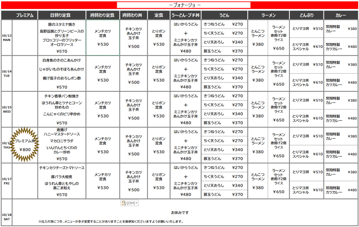 【摂南大】寝屋川:ブォナージョ 10月13日からの1週間メニュー