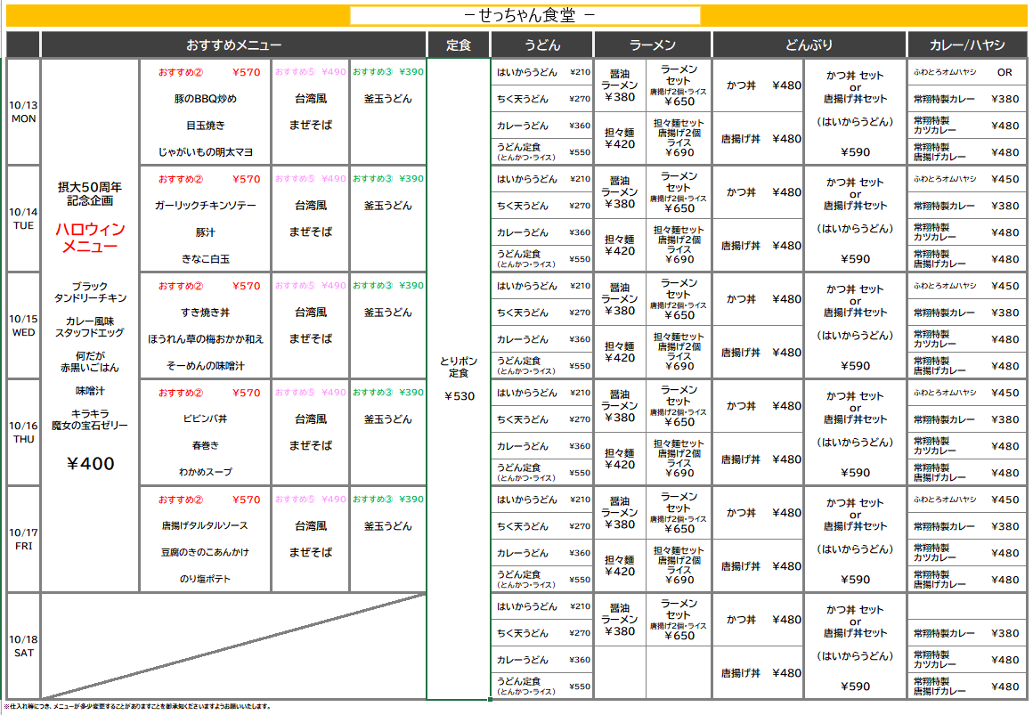 【摂南大】寝屋川:せっちゃん食堂 10月13日からの1週間メニュー