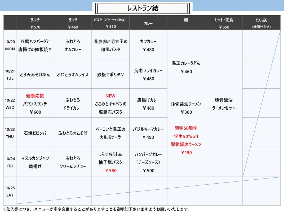 【摂南大】枚方:レストラン結 10月20日からの1週間メニュー