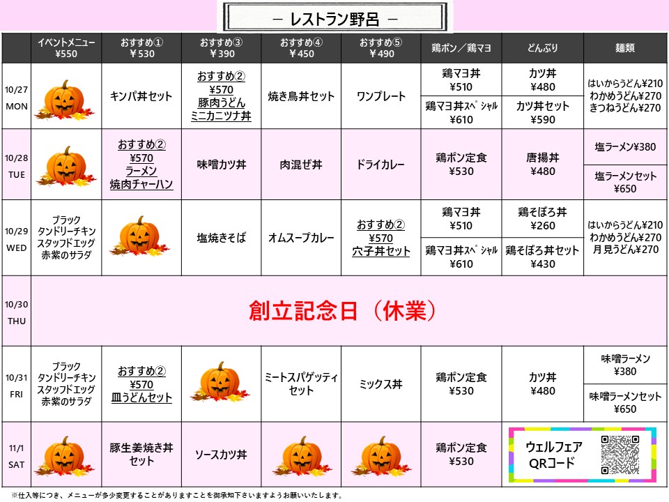 【広国大】東広島:レストラン野呂 10月27日からの1週間メニュー