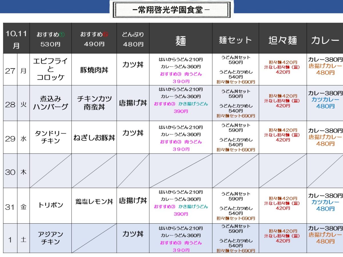 【常翔啓光中・高】啓光学園食堂 10月27日からの1週間メニュー
