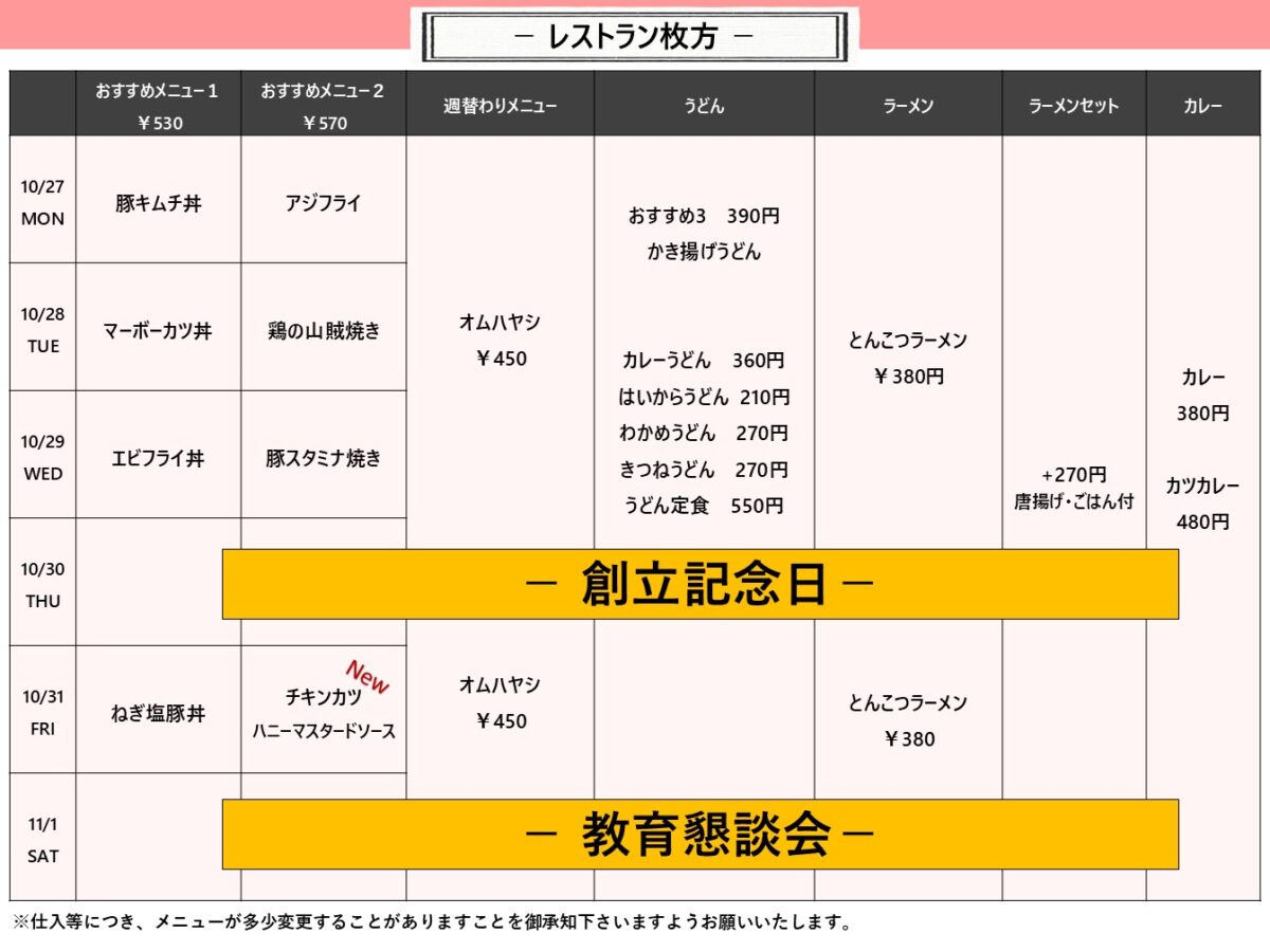 【摂南大】枚方:枚方食堂 10月27日からの1週間メニュー