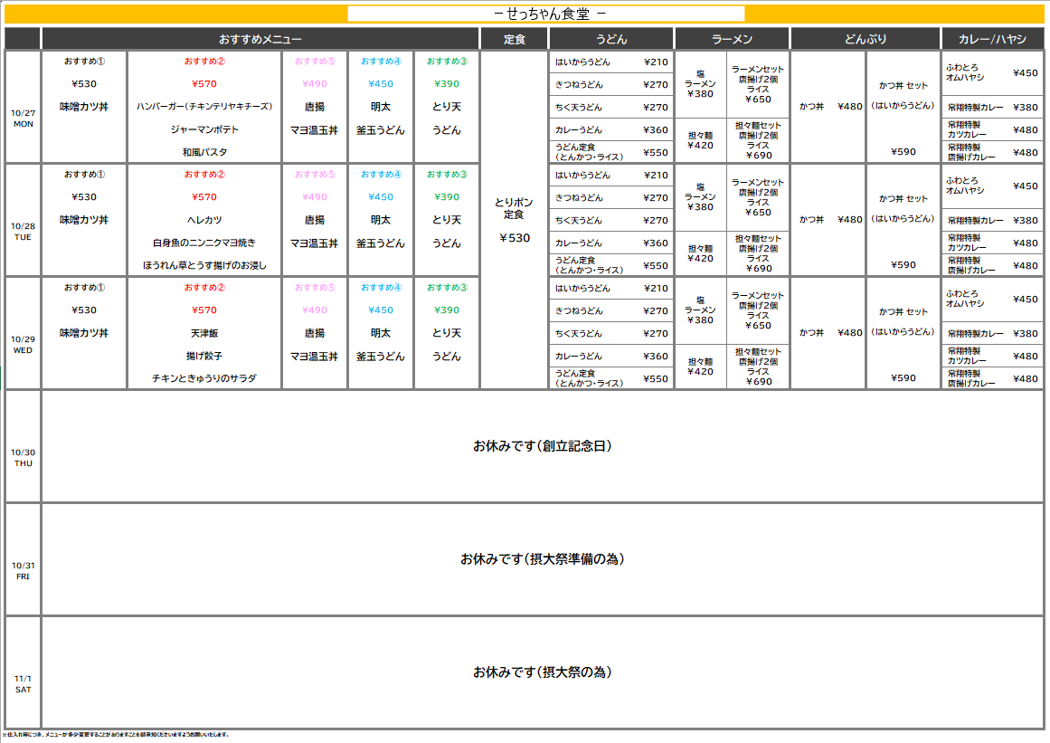 【摂南大】寝屋川:せっちゃん食堂 10月27日からの1週間メニュー