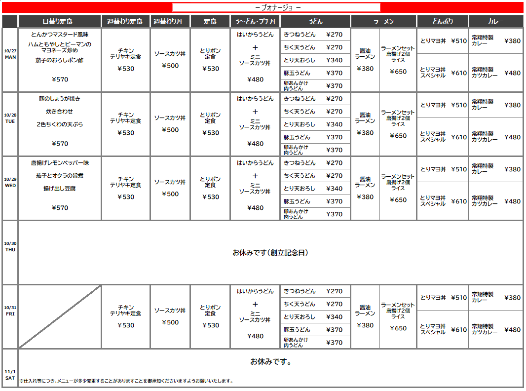 【摂南大】寝屋川:ブォナージョ 10月27日からの1週間メニュー