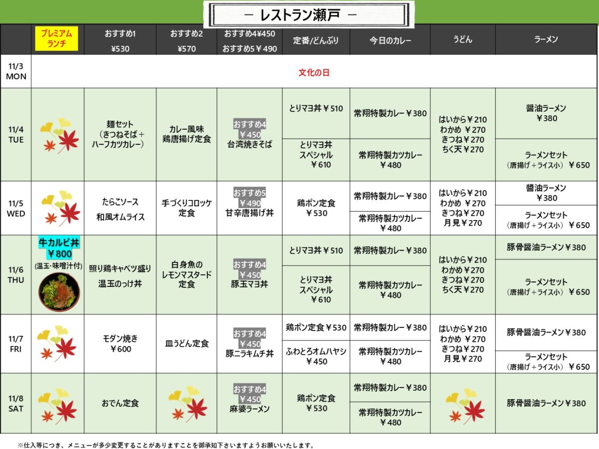 【広国大】呉: レストラン瀬戸 11月3日からの1週間メニュー