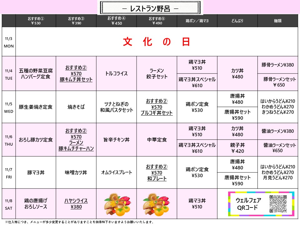 【広国大】東広島:レストラン野呂 11月3日からの1週間メニュー