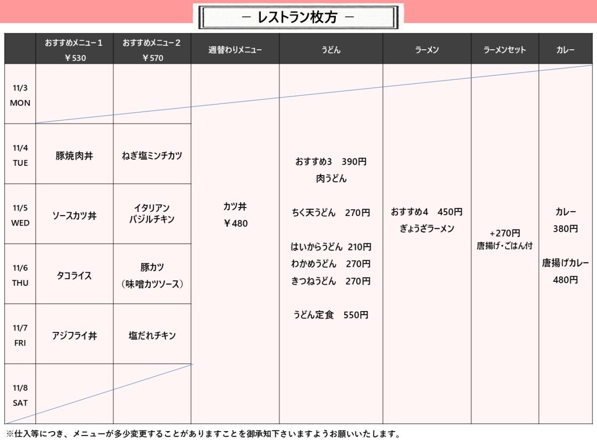 【摂南大】枚方:枚方食堂 11月3日からの1週間メニュー