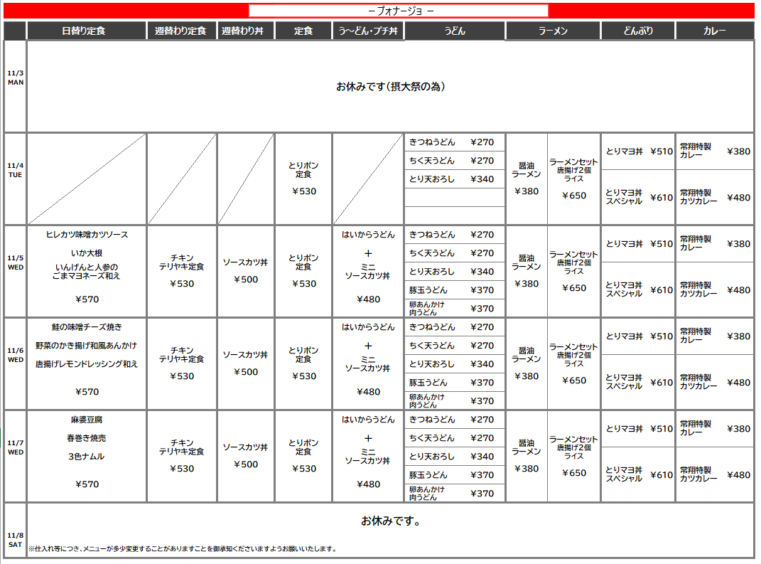 【摂南大】寝屋川:ブォナージョ 11月3日からの1週間メニュー