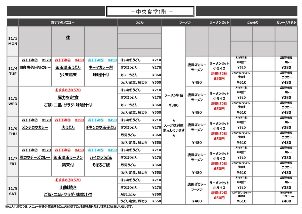 【大工大】大宮:中央食堂1階 11月3からの1週間メニュー
