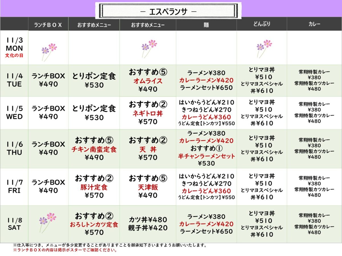 【常翔学園中・高】エスペランサ 11月3日からの1週間メニュー
