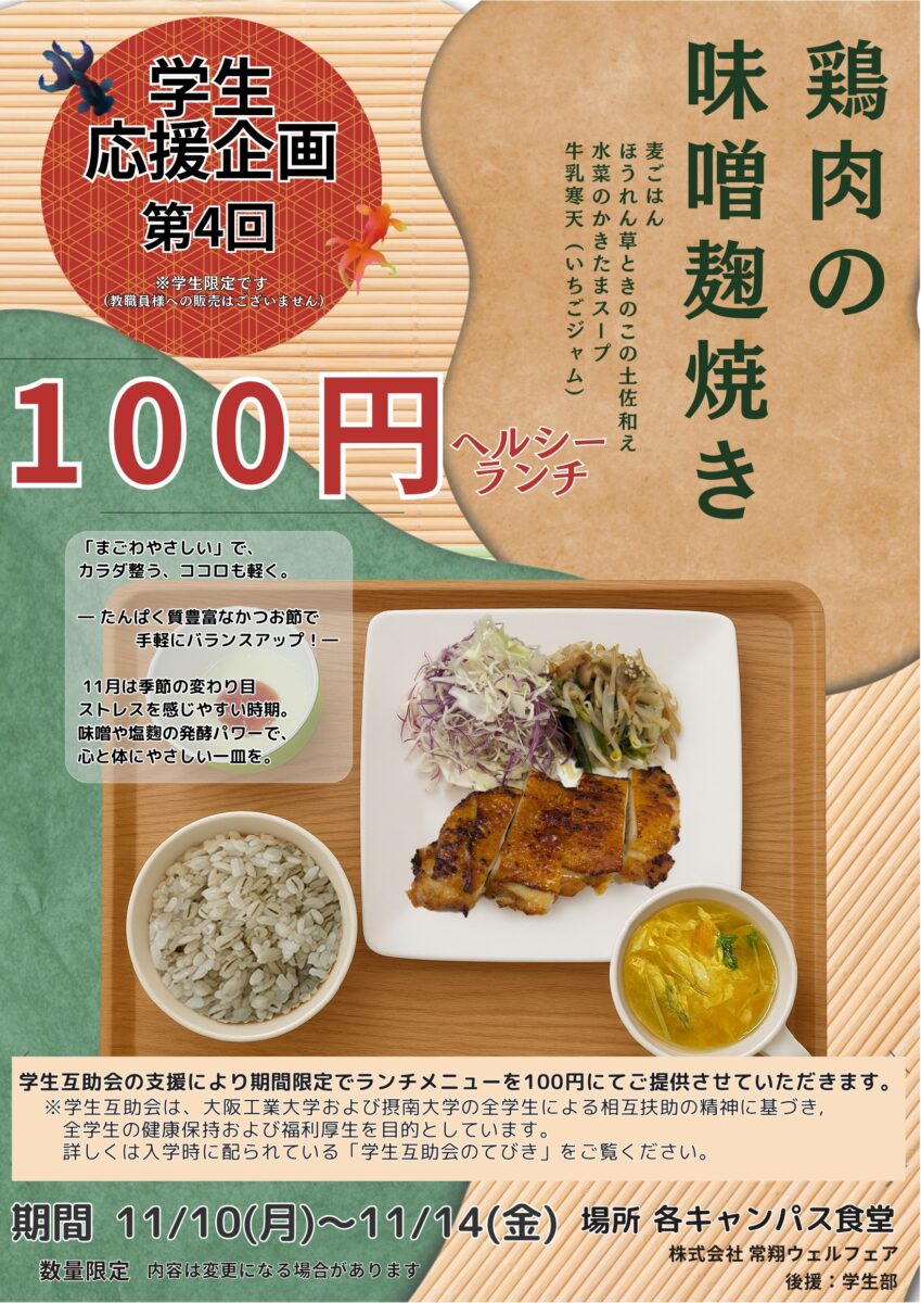【工大・摂大】互助会応援企画 100円ランチ11/10(月)~11/14(金)