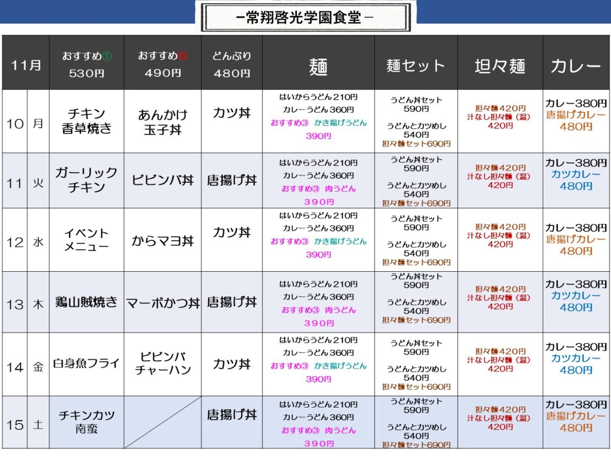 【常翔啓光中・高】啓光学園食堂 11月10日からの1週間メニュー