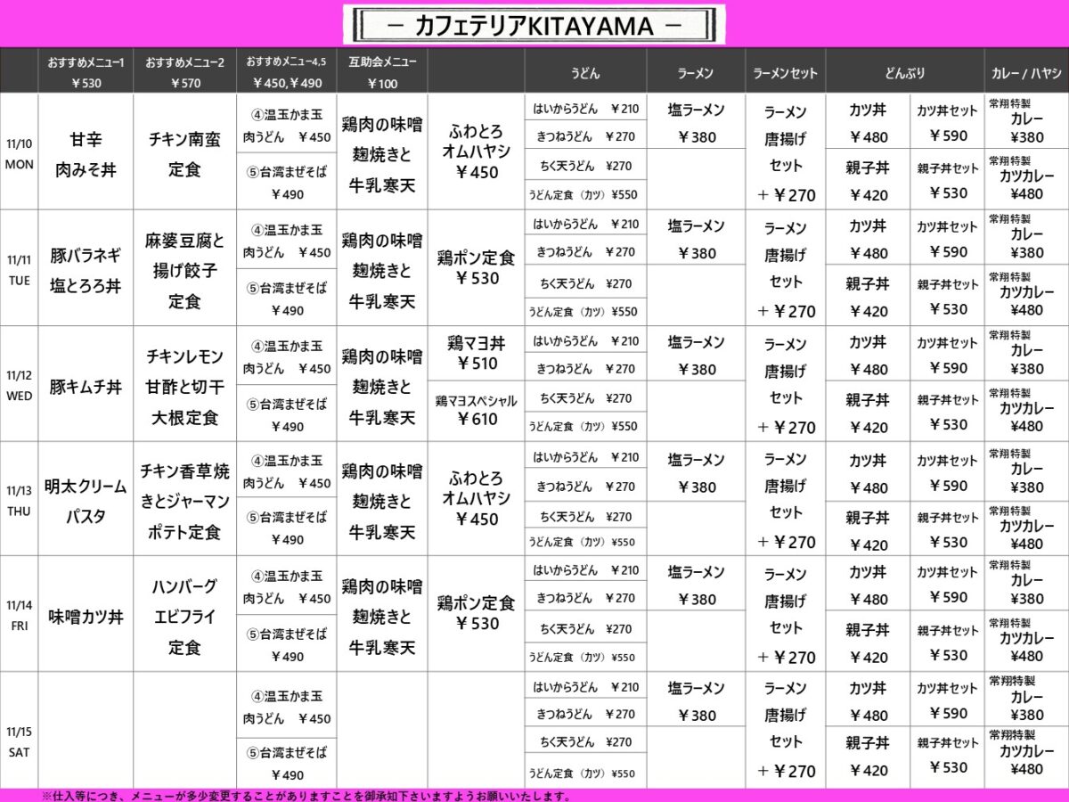 【大工大】枚方:カフェテリアKITAYAMA 11月10日からの1週間メニュー