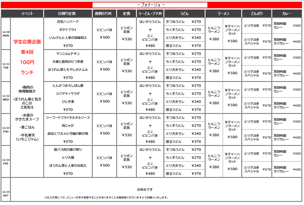 【摂南大】寝屋川:ブォナージョ 11月10日からの1週間メニュー