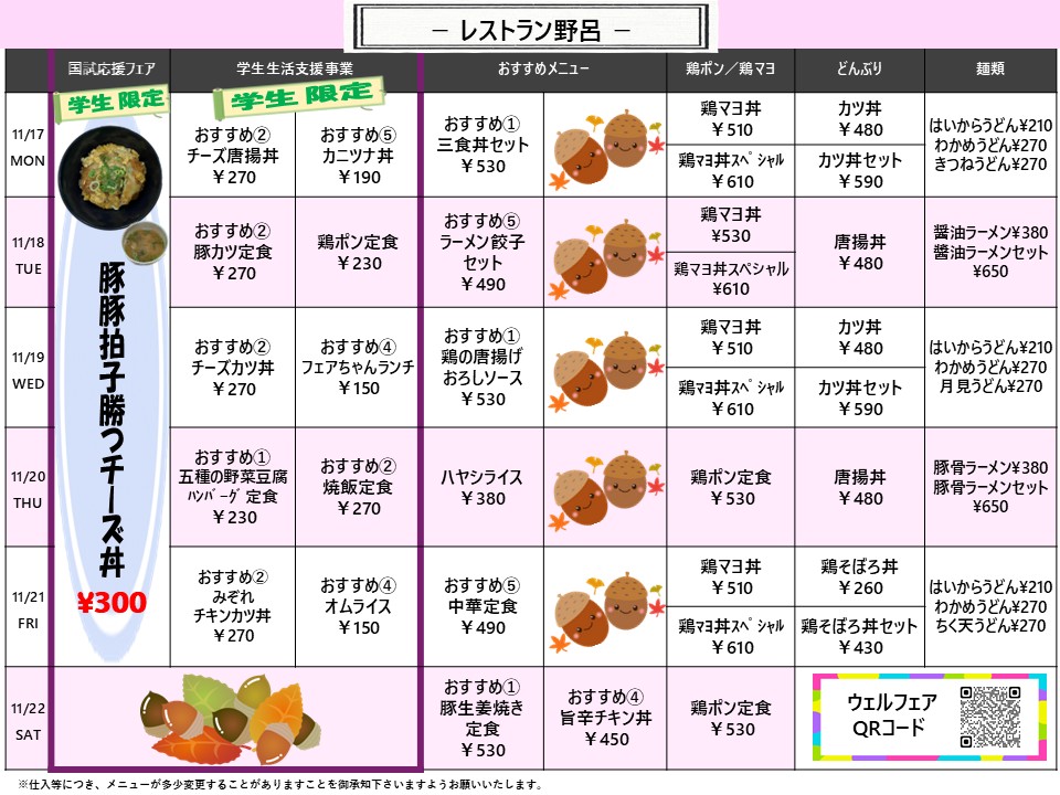 【広国大】東広島:レストラン野呂 11月17日からの1週間メニュー