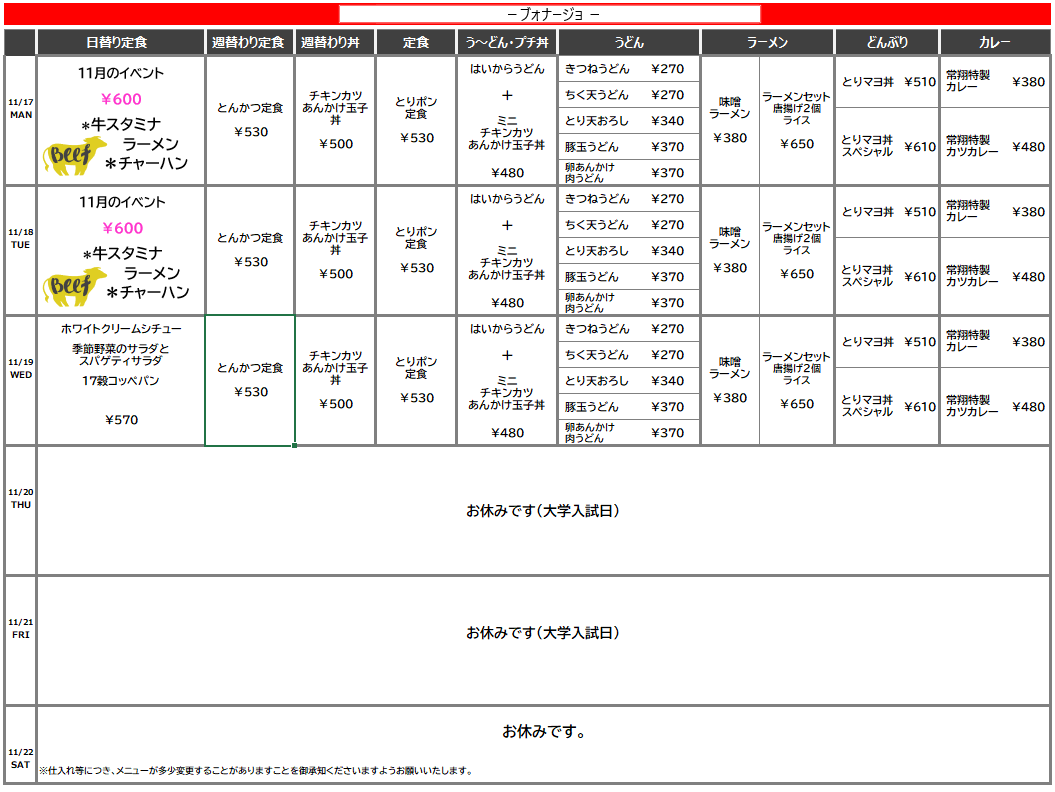【摂南大】寝屋川:ブォナージョ 11月17日からの1週間メニュー