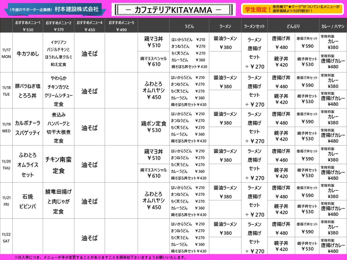 【大工大】枚方:カフェテリアKITAYAMA 11月17日からの1週間メニュー