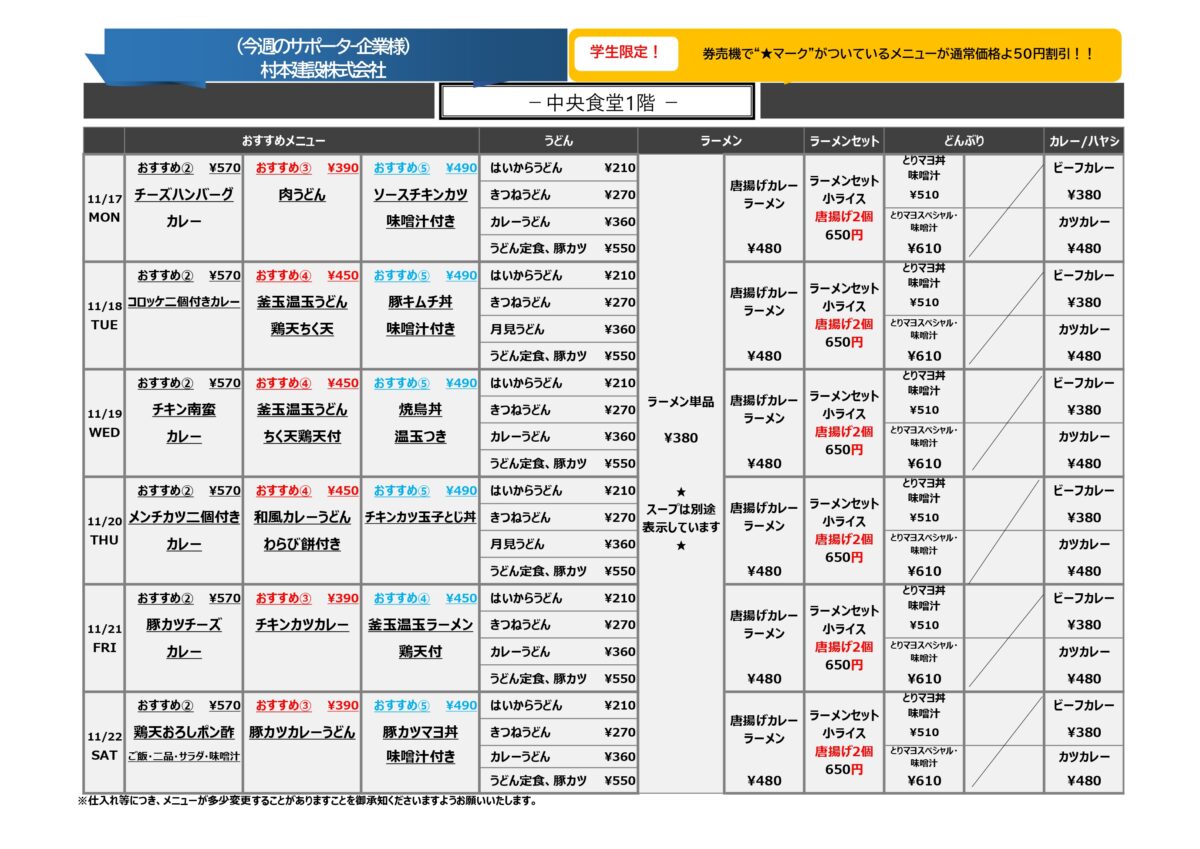 【大工大】大宮:中央食堂1階 11月17日からの1週間メニュー
