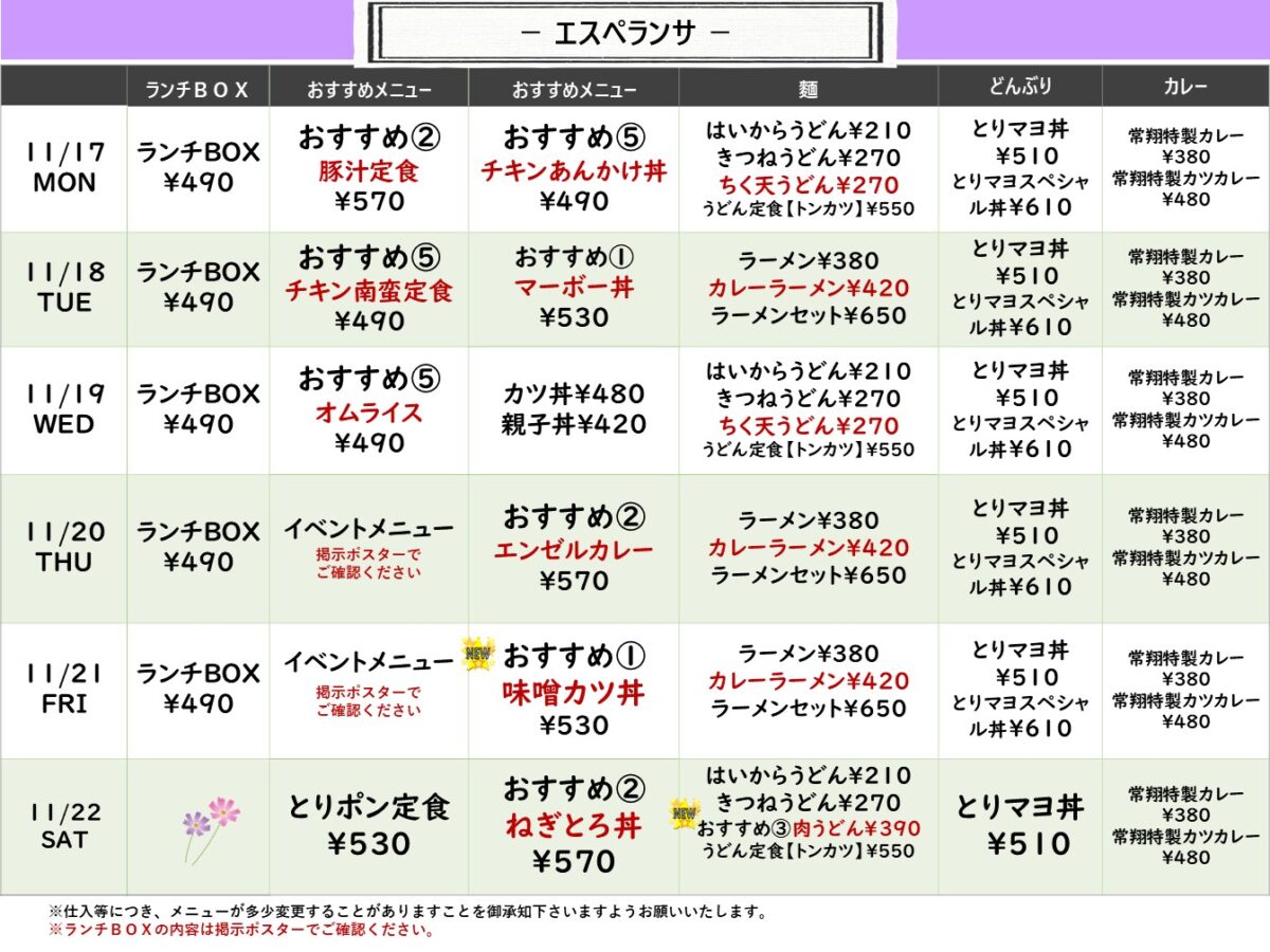 【常翔学園中・高】エスペランサ 11月17日からの1週間メニュー