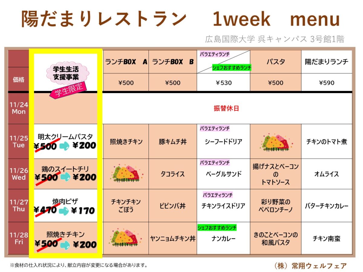 【広国大】呉: 陽だまりレストラン 11月24日からの1週間メニュー