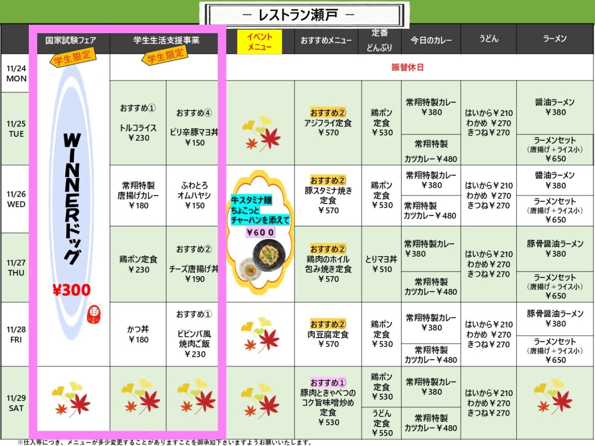 広国大】呉: レストラン瀬戸 11月24日からの1週間メニュー