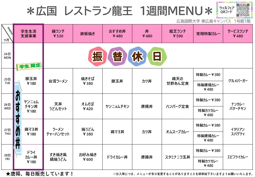 【広国大】東広島:レストラン龍王 11月24日からの1週間メニュー