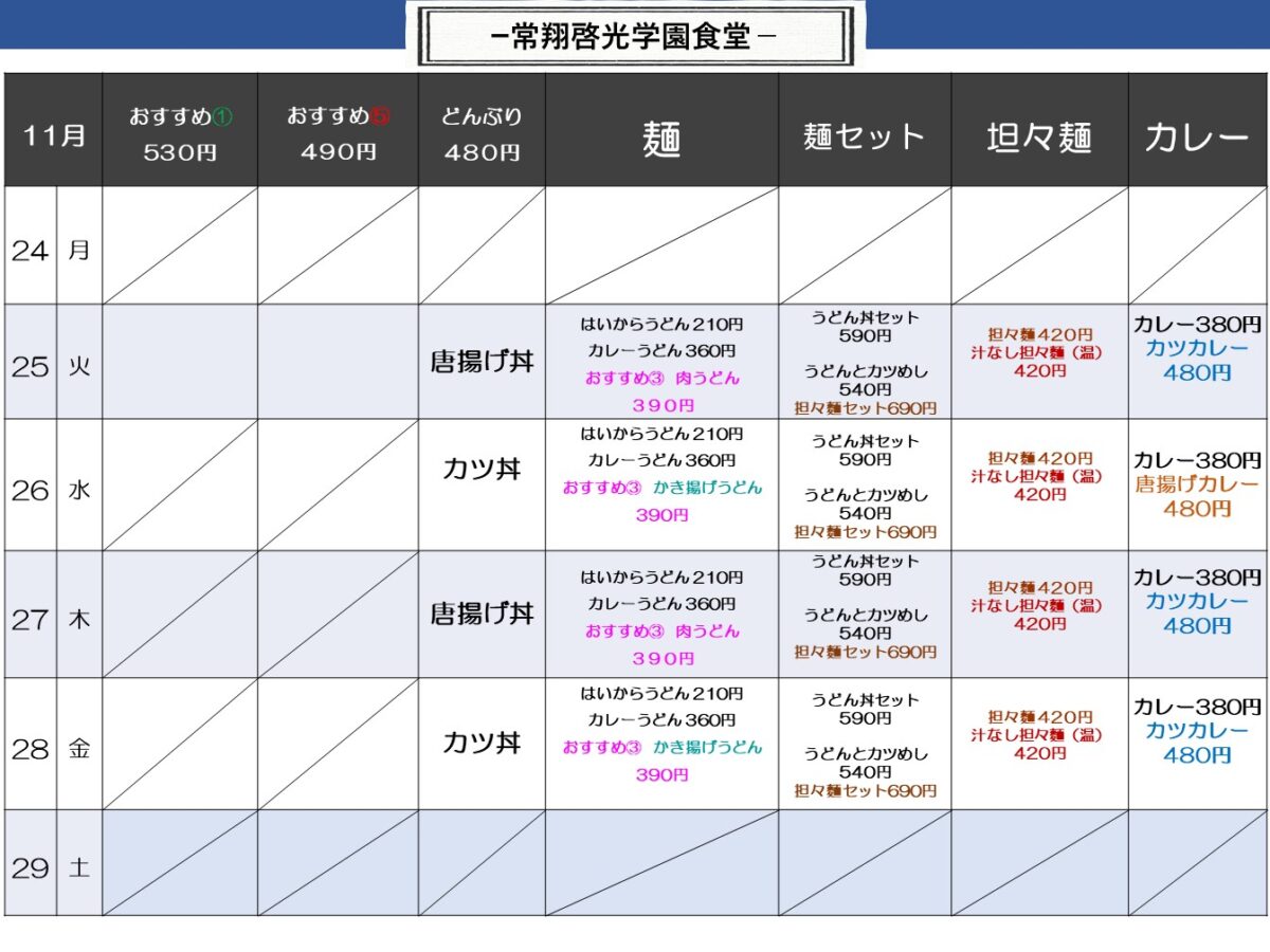【常翔啓光中・高】啓光学園食堂 11月24日からの1週間メニュー