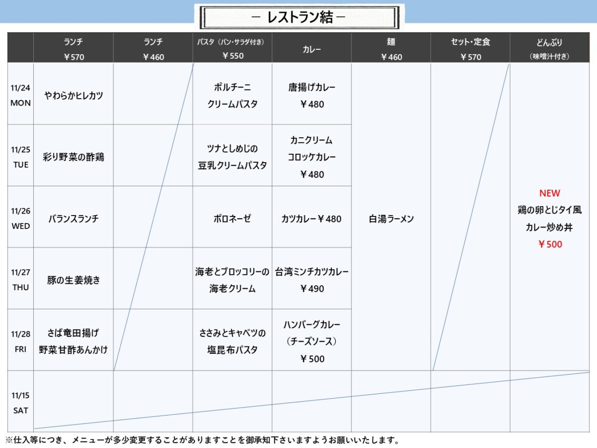 【摂南大】枚方:レストラン結 11月24日からの1週間メニュー