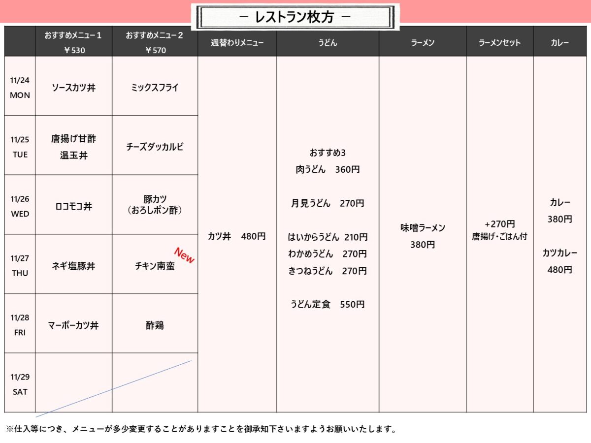【摂南大】枚方:枚方食堂 11月24日からの1週間メニュー